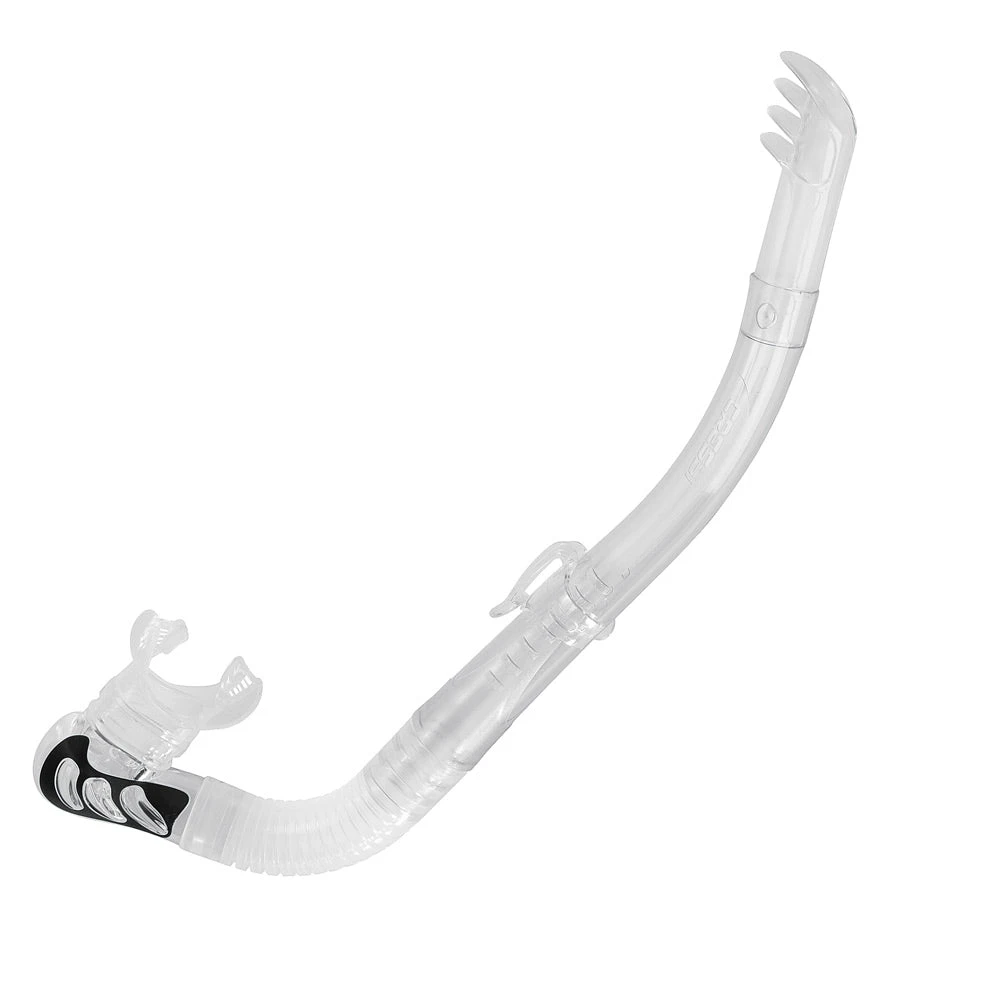 The purge system has an elliptical valve and is contained in a special water collection well. The mouthpiece is identical to the ones mounted on Cressi regulators and can be swapped as the need may be. Purge system and bore are connected by a corrugated section on the outer side only (smooth inside) this is curved so that the mouthpiece arrives at the diver’s mouth with a gentle natural bend. The mask attachment is a rapid, height adjustable clip-on.
