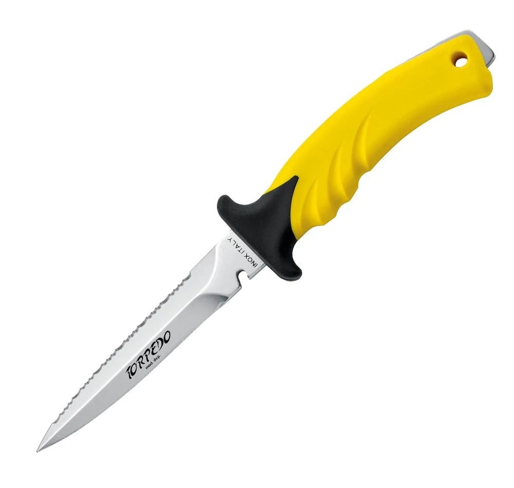 This is the Mac Coltellerie Torpedo 11 Knife. It is the perfect companion for spearfishing adventures. The Stainless Steel blade is durable and corrosion resistant. The spearfishing knife features two edges; one straight edge for making clean cuts and one serrated edge to saw through ropes. Also integrated is a line cutter and point-tip. The Torpedo 11 is a strong stiletto style knife, also suitable for diving. It has a comfortable handle (PP with TPE overmould) and secure friction locking mechanism. A sheath is included, which securely locks the knife in place and offers attachment points for your gear or a leg strap. Further features include a hard metal bolster for hammering, a flopper adjuster tool and a lanyard attachment hole in handle.