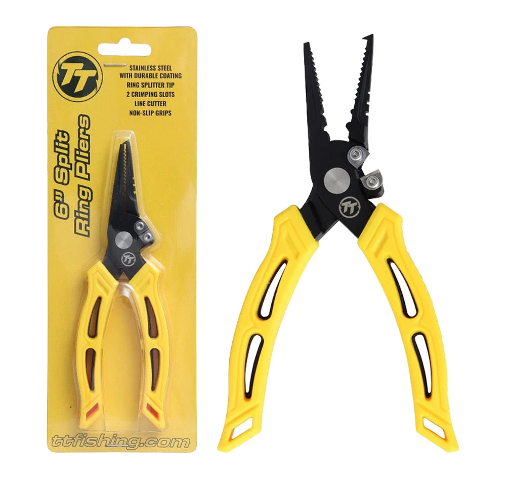 The Tackle Tactics 6″ Split Ring Pliers are designed to make adding or changing split rings and trebles quick and easy, with their ring splitter tip, stainless steel construction with durable PTFE coating and spring loaded design for easy one-handed operation. Other features of these quality split ring pliers include serrated grips, two crimping slots, braid and monofilament line cutter, non-slip moulded grips and high visibility yellow colour.